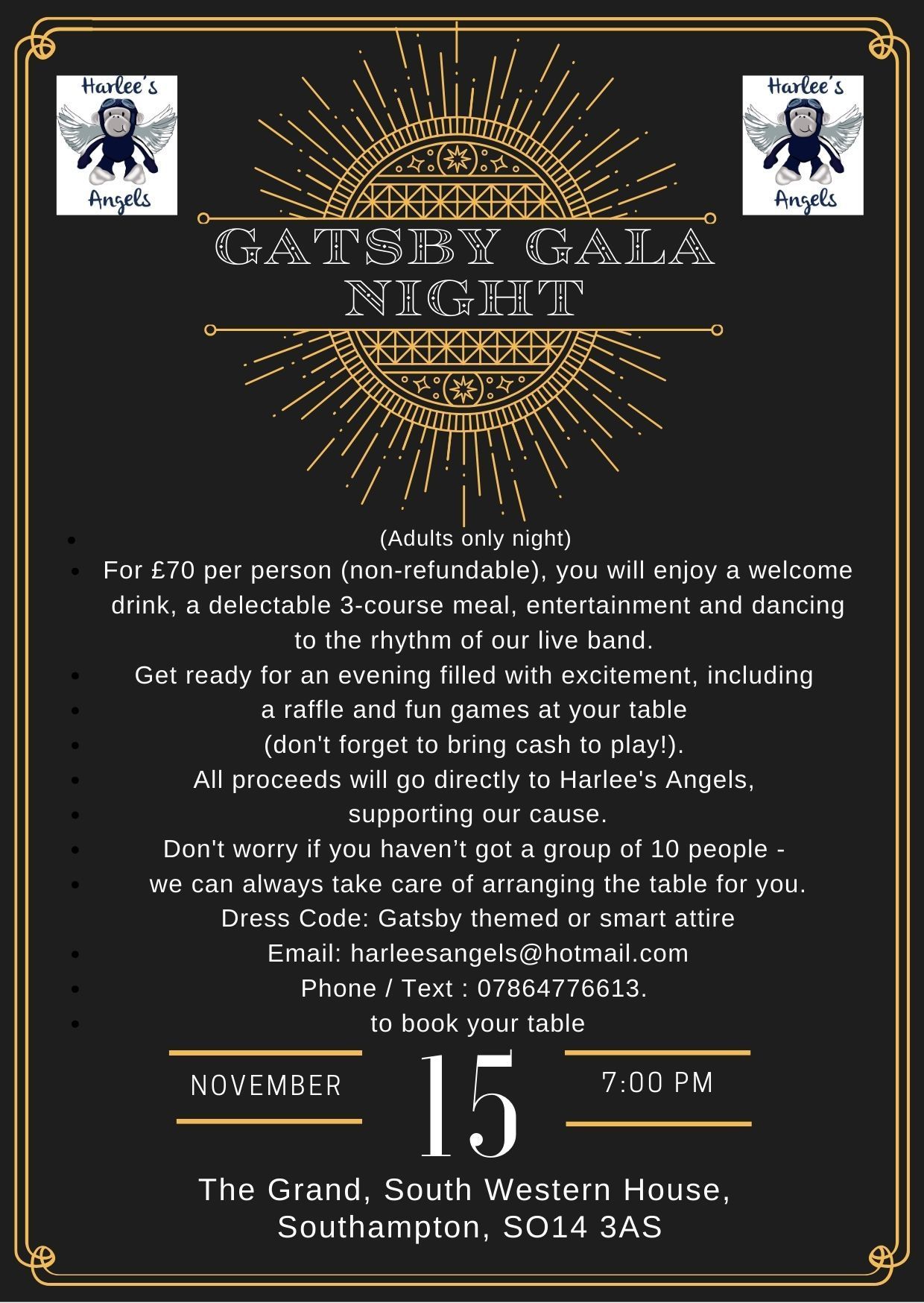 We are excited to announce our Great Gatsby Charity Night in support of Harlee’s Angels! Get ready for an evening filled with fun, food, and fantastic entertainment, all for a great cause.